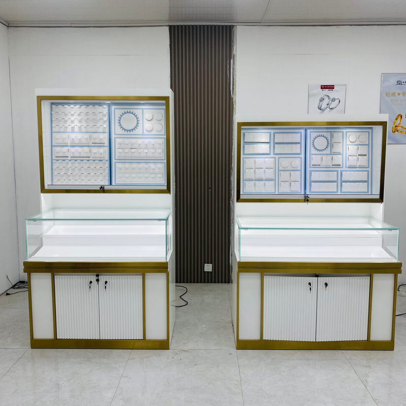 El interior del gabinete de pantalla está equipado con cerraduras de seguridad de alta calidad, como bloqueos de contraseña, bloqueos de huellas digitales, etc., para garantizar el almacenamiento seguro de joyas. Al mismo tiempo, algunos gabinetes de exhibición también tienen sistemas de alarma incorporados. Una vez que alguien intenta abrir ilegalmente el gabinete de pantalla, el sistema sonará inmediatamente una alarma para evitar el robo de manera efectiva.