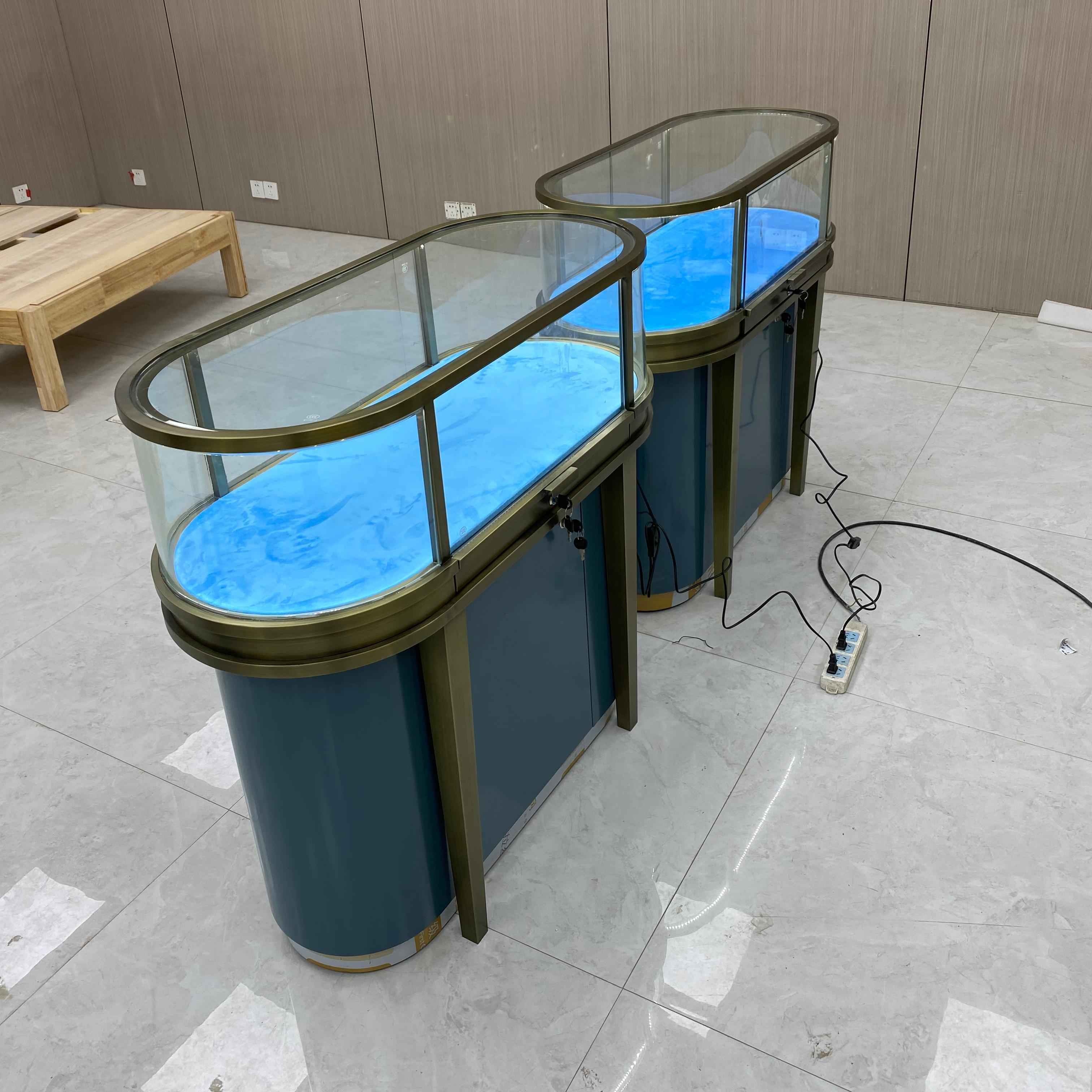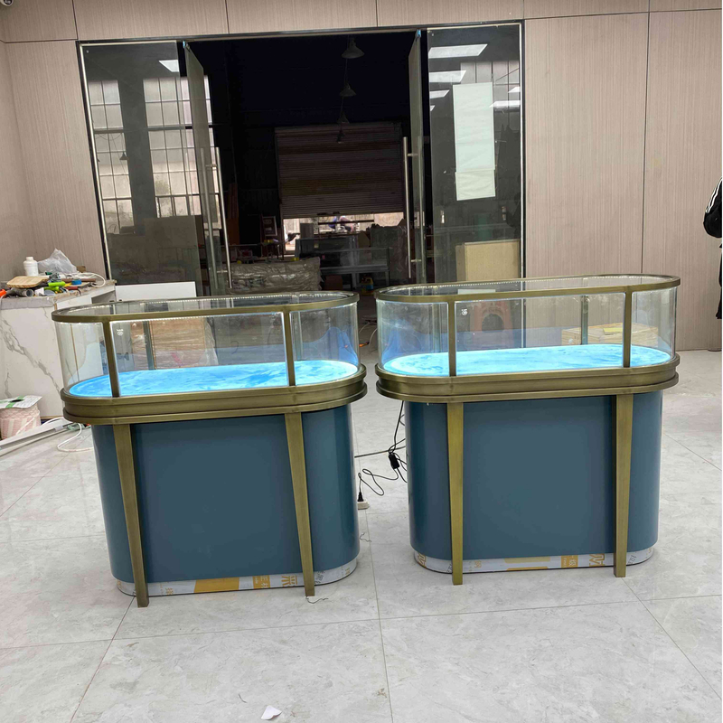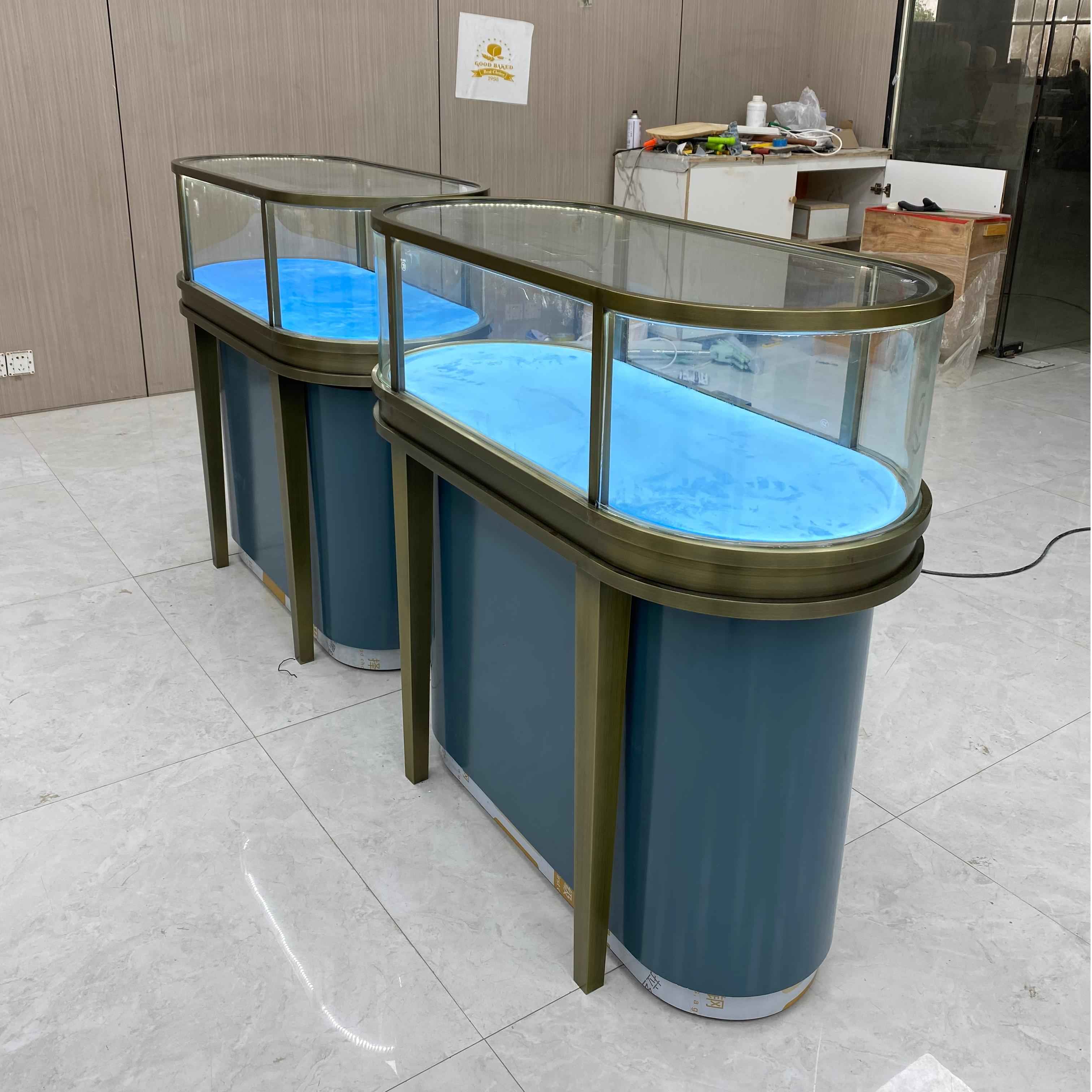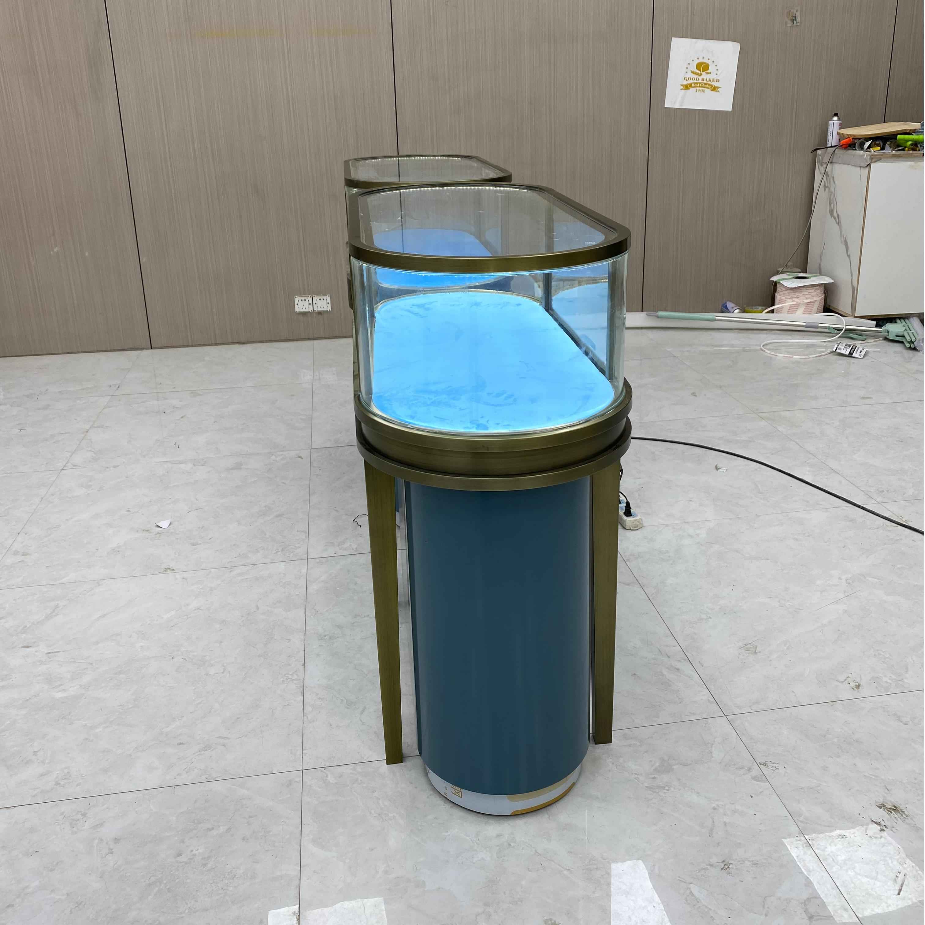 Este es un elegante gabinete de visualización de vidrio. El tamaño es L120*W60*H95cm.it presenta un marco de acero inoxidable de color bronce con un acabado cepillado, lo que le da una apariencia sofisticada y lujosa. El gabinete está hecho de vidrio templado transparente de 8 mm, que es resistente y claro, lo que permite una buena vista de los artículos en el interior. El interior está forrado con terciopelo azul, proporcionando un telón de fondo suave y elegante. La base del gabinete también es azul, e incluye un pequeño espacio de almacenamiento, que es conveniente para mantener artículos relacionados.