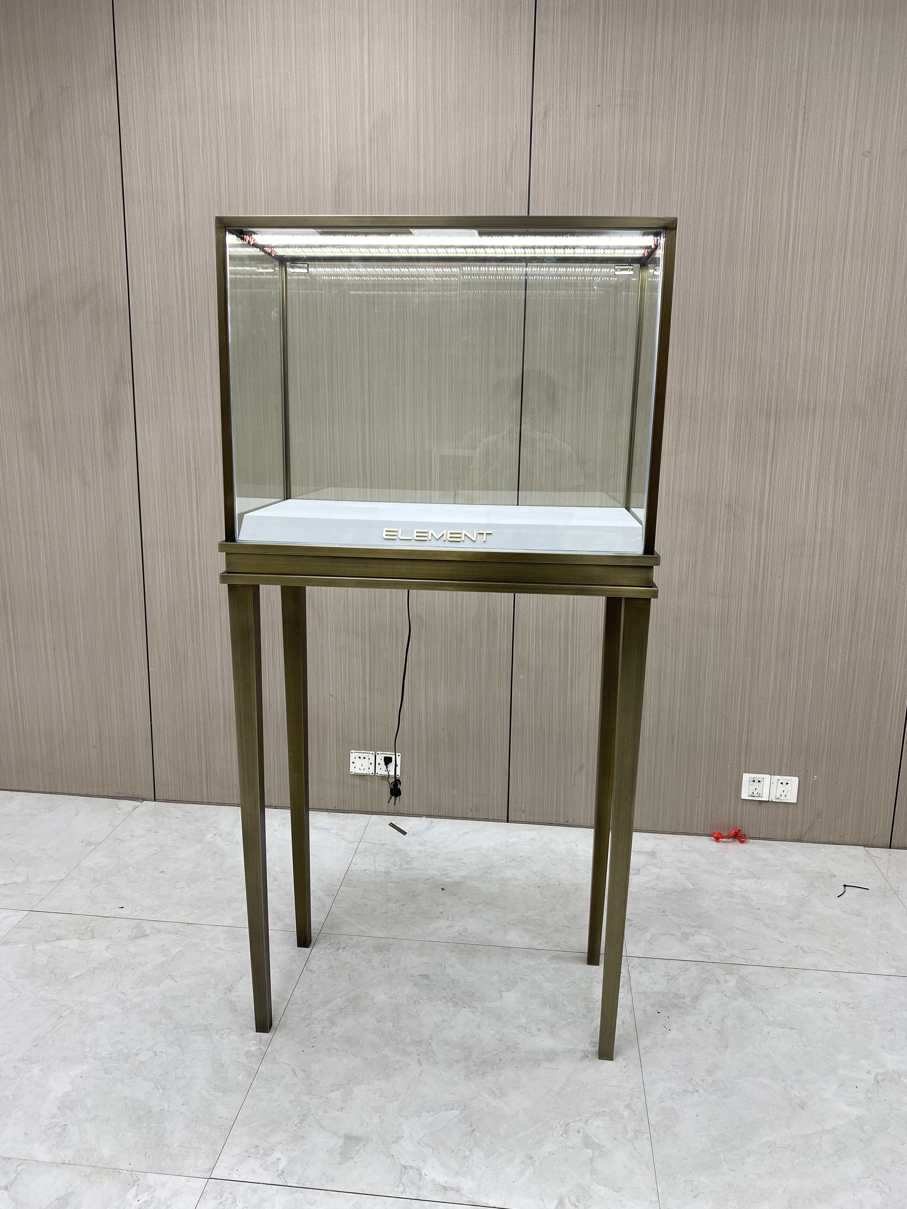 La compañía tiene productos de gabinete de exhibición de joyas de bronce.