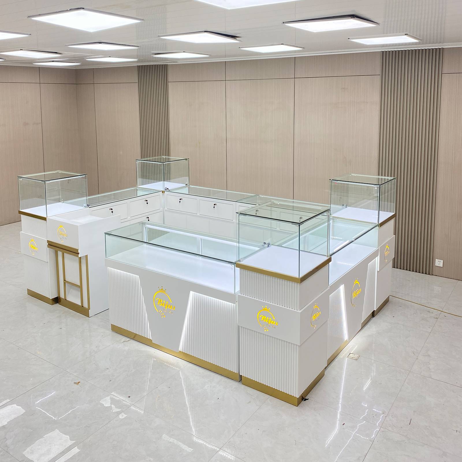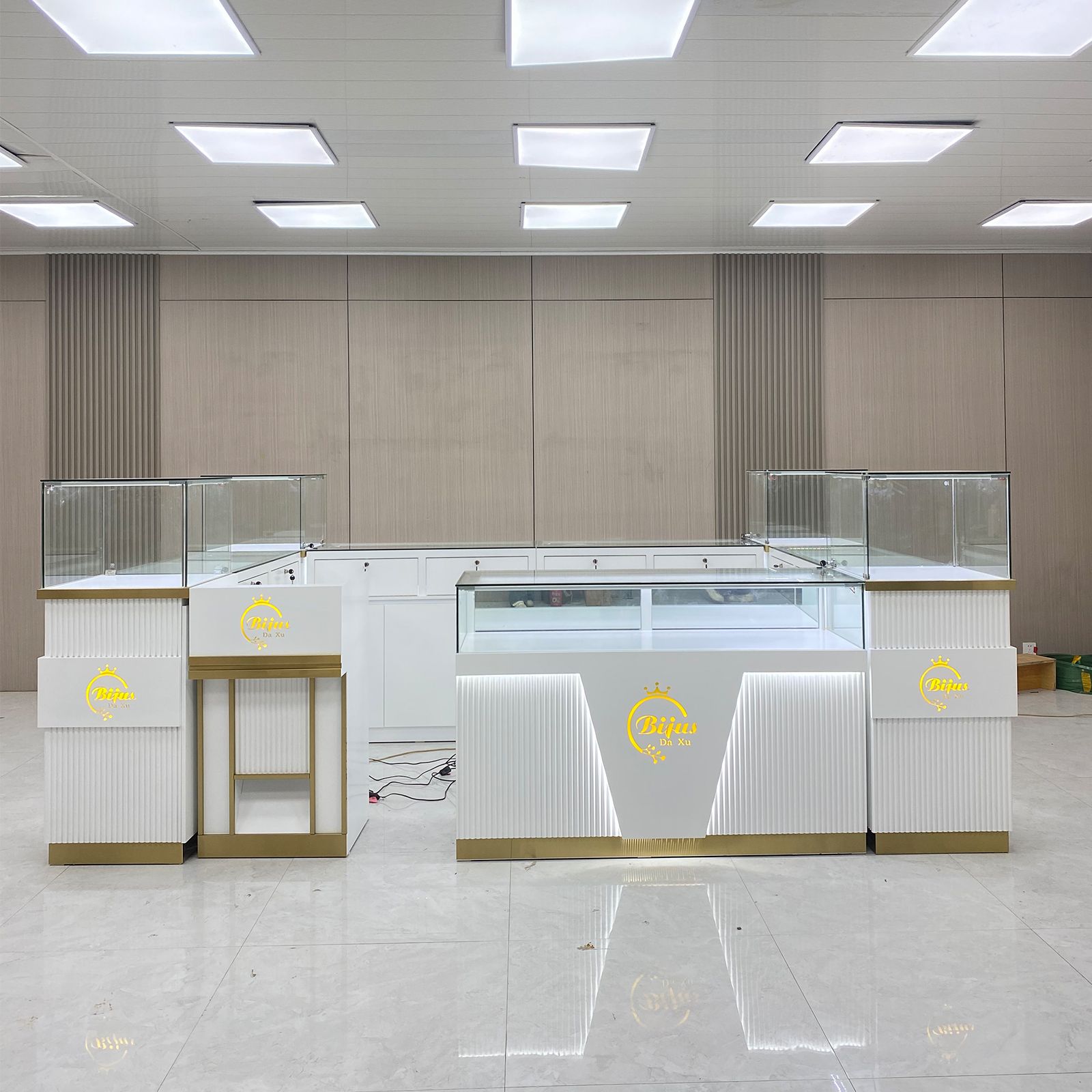 El gabinete de exhibición utiliza una base pintada blanca con líneas decorativas doradas, que se ve muy alta. El vidrio templado transparente sin marco no solo puede mostrar bien las joyas, sino que también tiene seguridad. El gabinete de exhibición está equipado con iluminación LED, que puede resaltar el brillo y los detalles de las joyas, haciendo que las joyas sean más deslumbrantes.