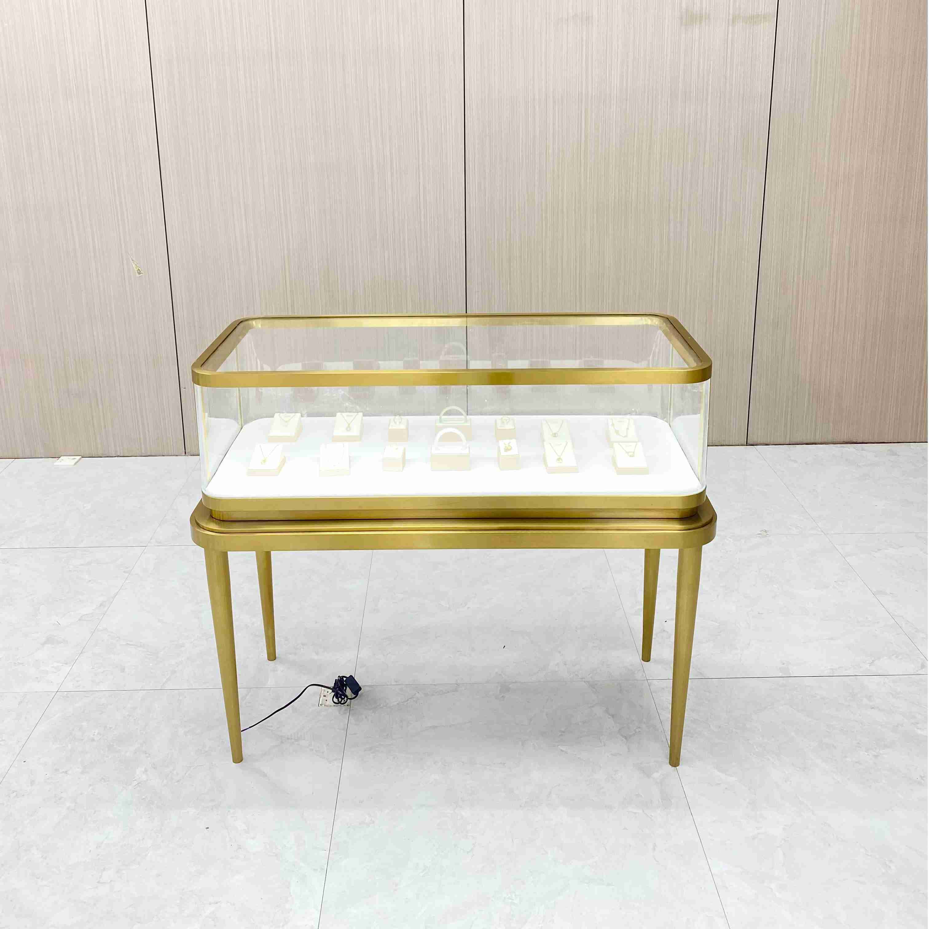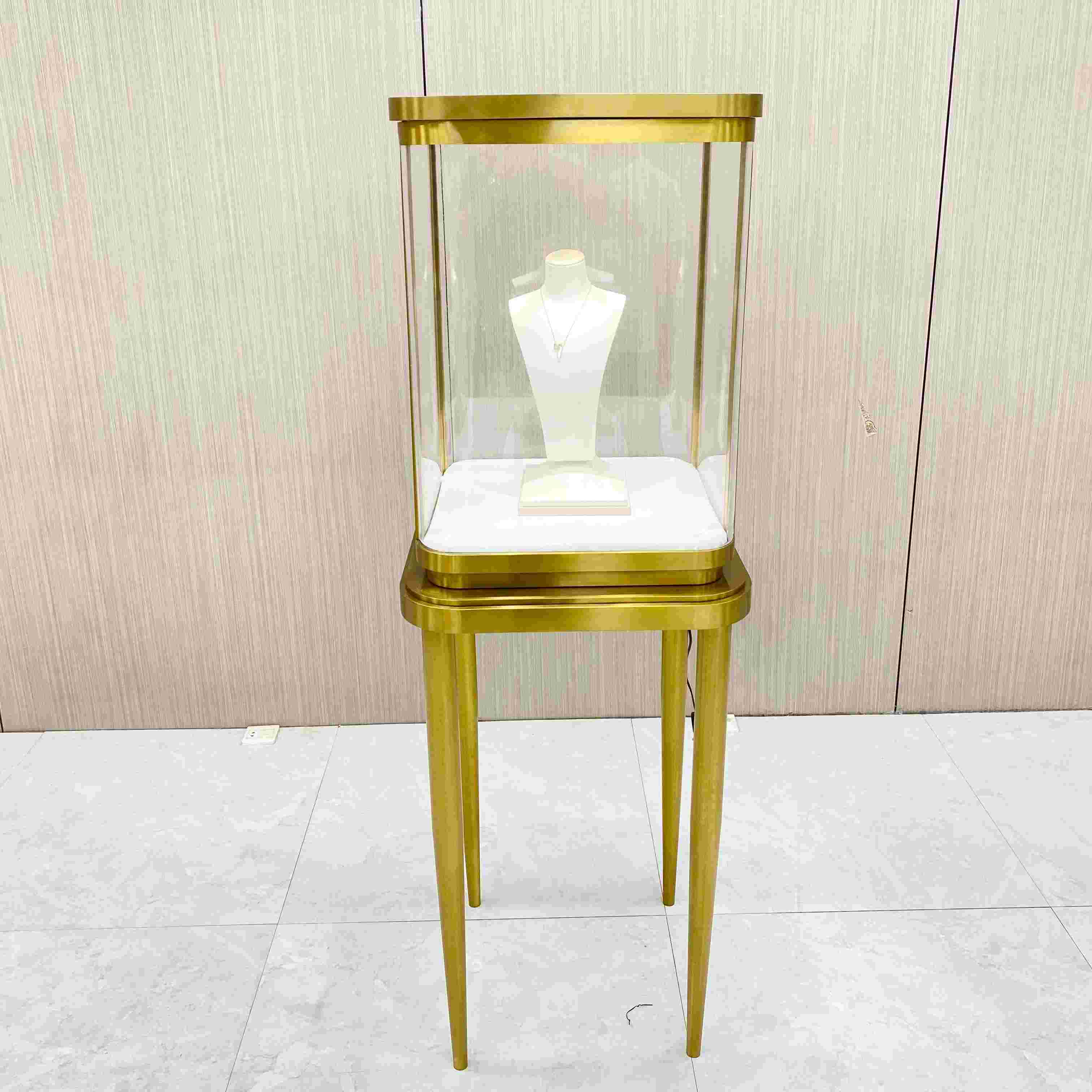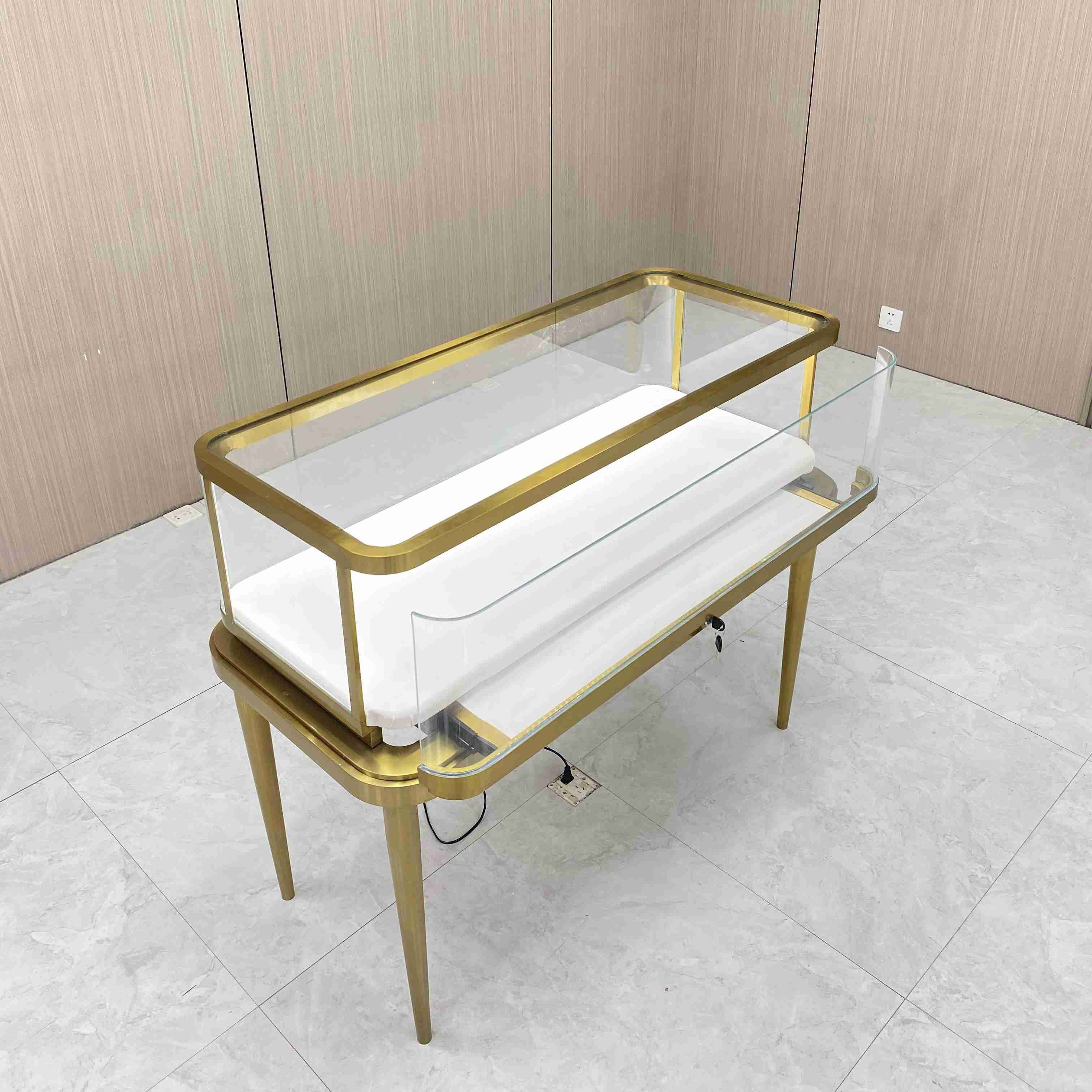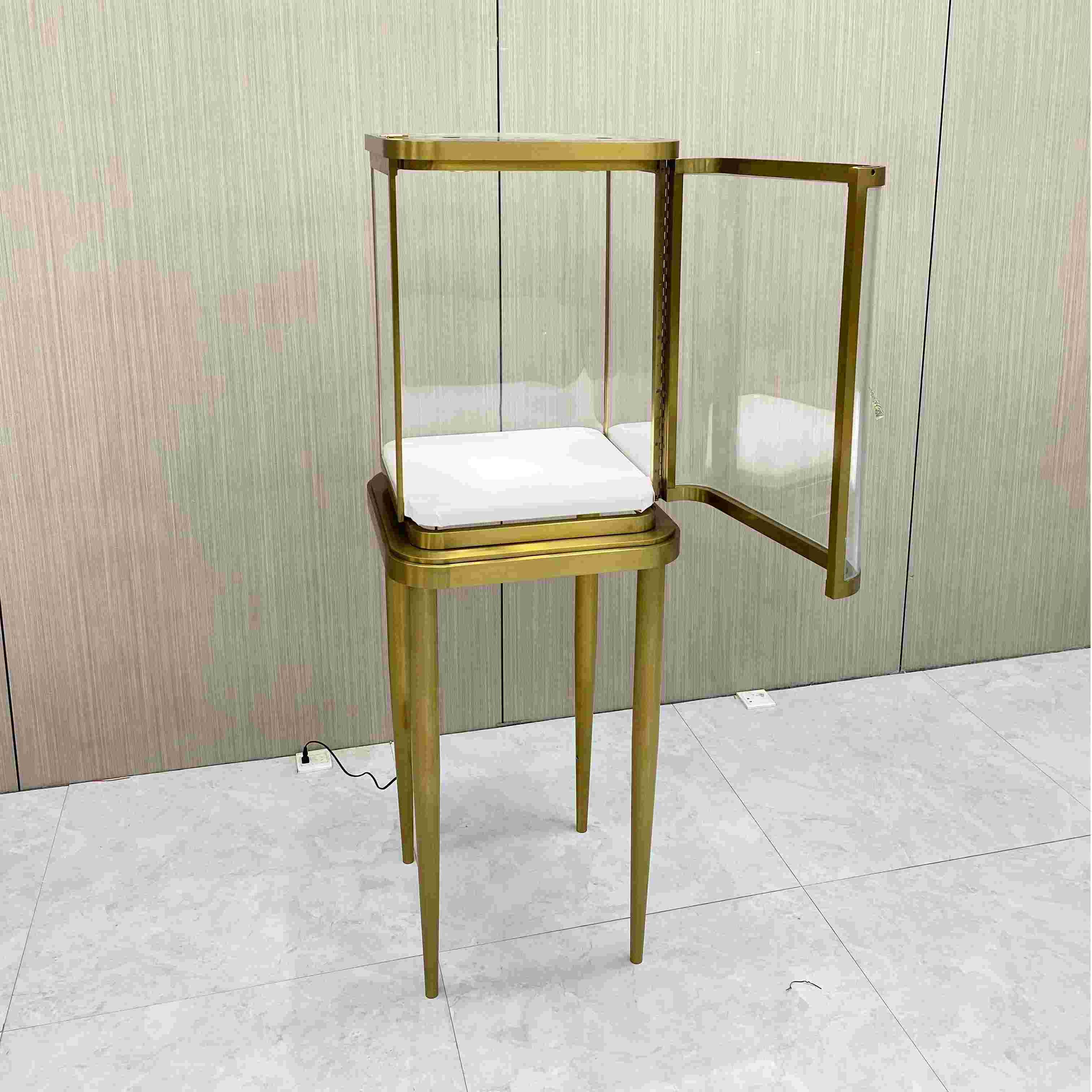 Este es un escaparate de joyas de lujo con el gabinete de exhibición de joyas delanteras y el gabinete de exhibición de joyería vertical. El tamaño delantero es L120*W60*H95cm. El tamaño vertical es L60*W60*H160c. En Italia, conocido por los productos de lujo y la artesanía fina, este tipo de vidrio es muy valorado debido a la tecnología avanzada y la artesanía cuidadosa necesaria para su producción, lo que lo hace costoso. El forro es de cuero blanco, que proporciona una superficie suave que protege las joyas de los rasguños.