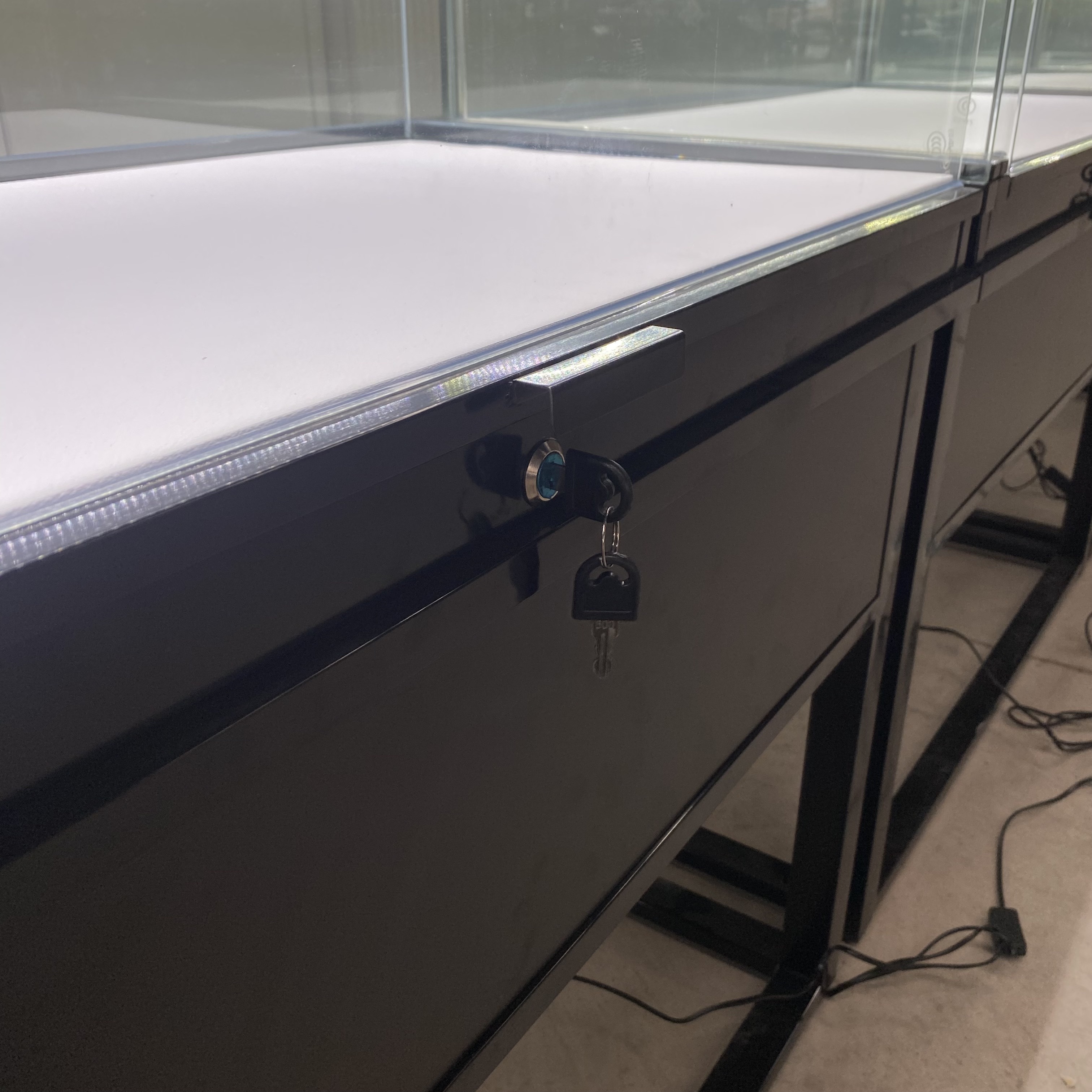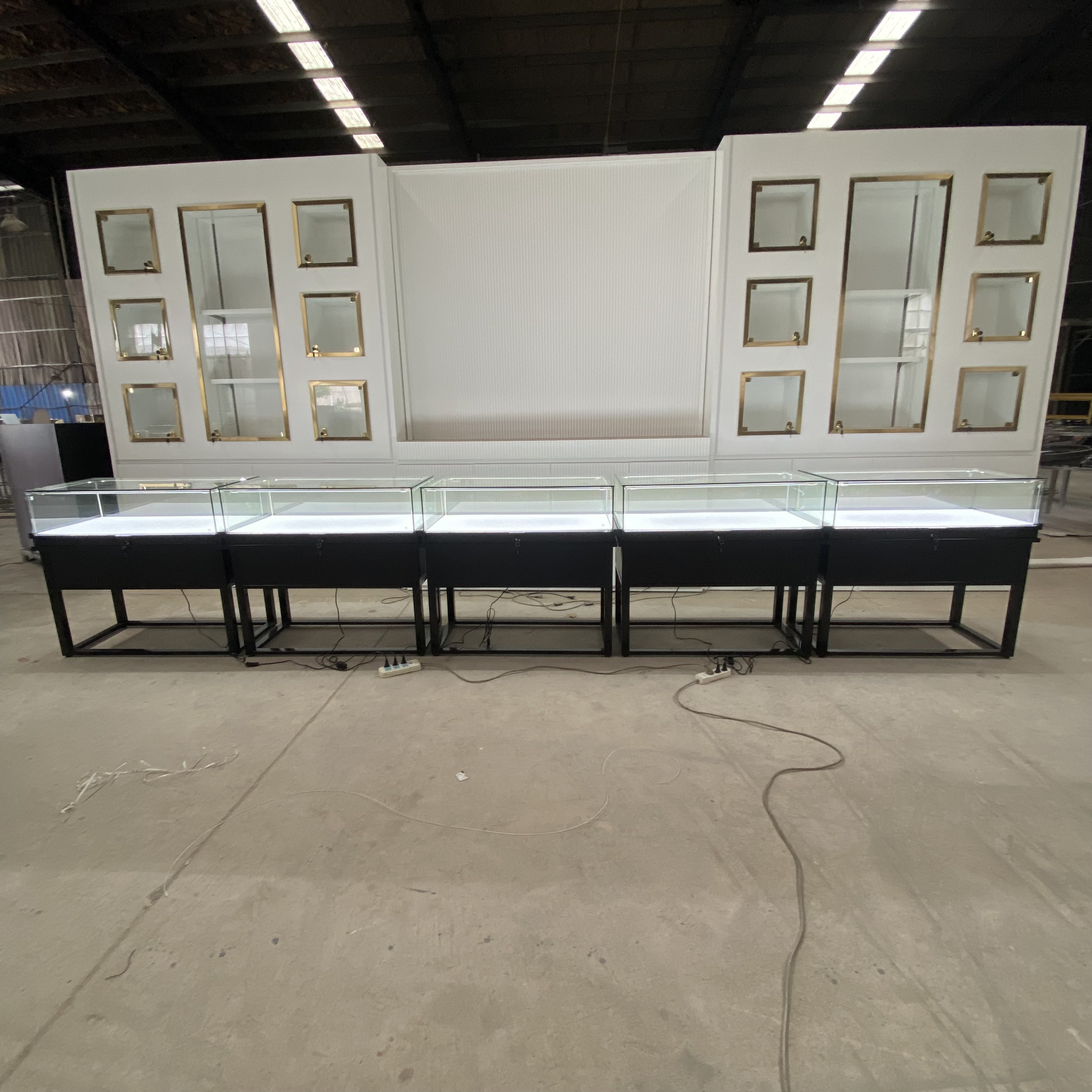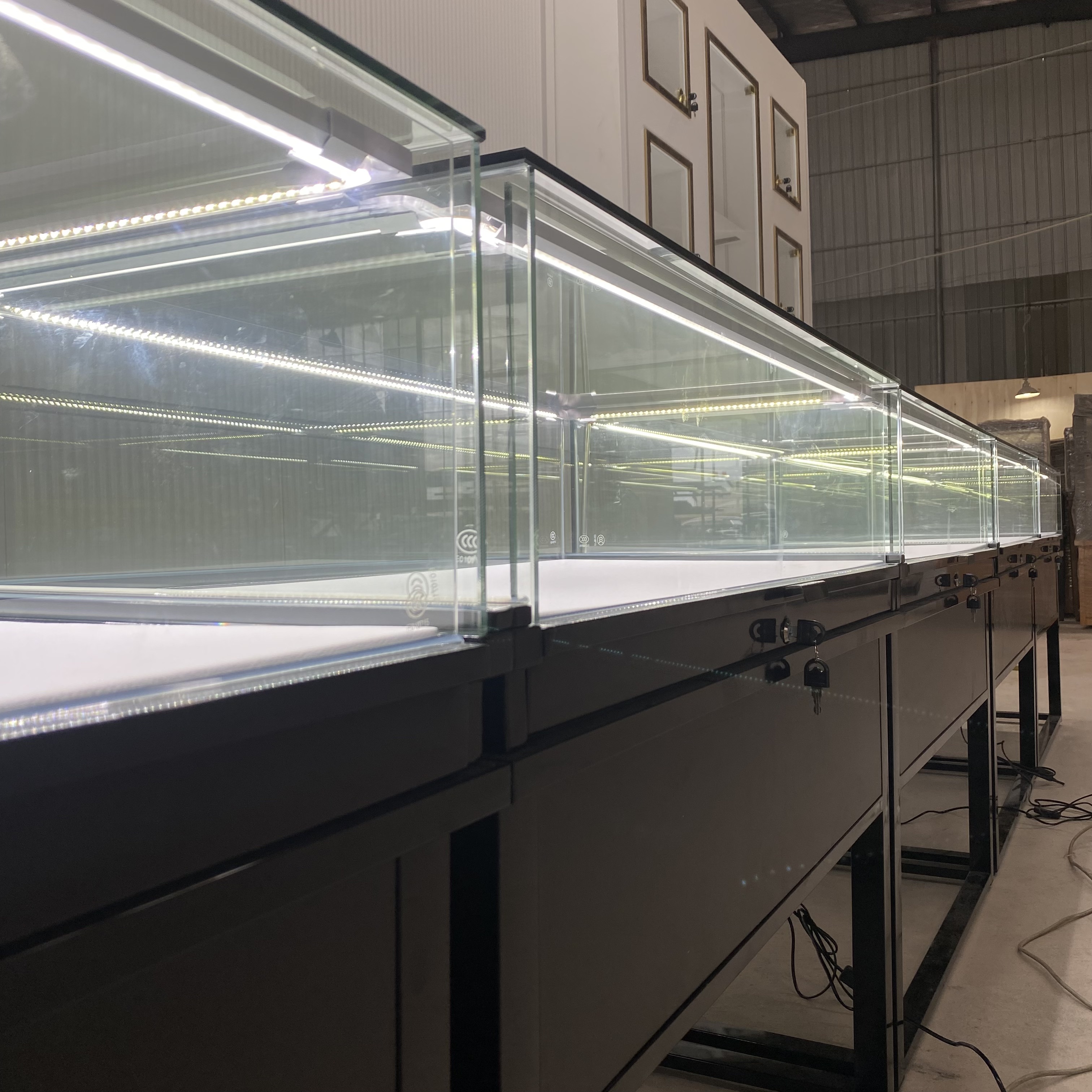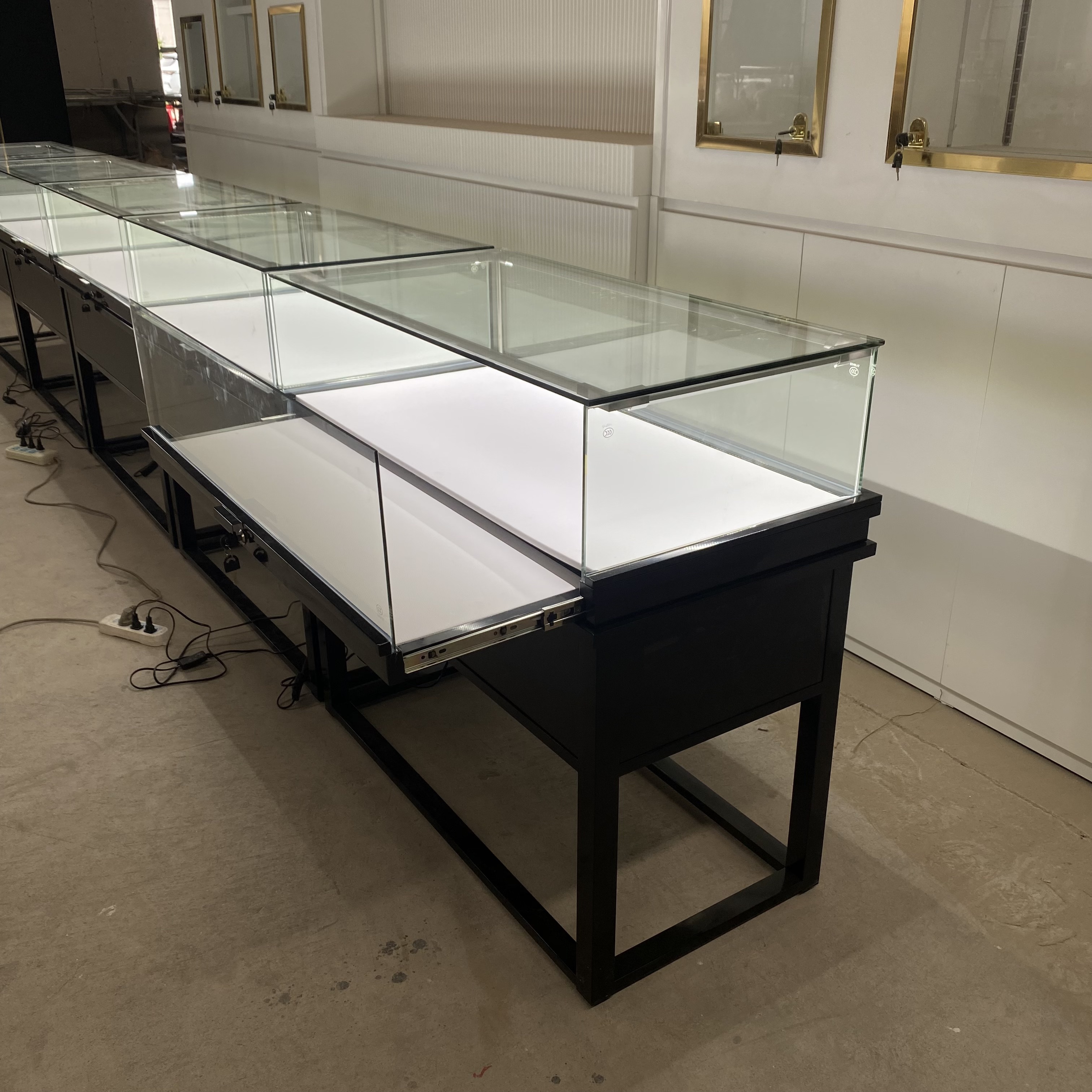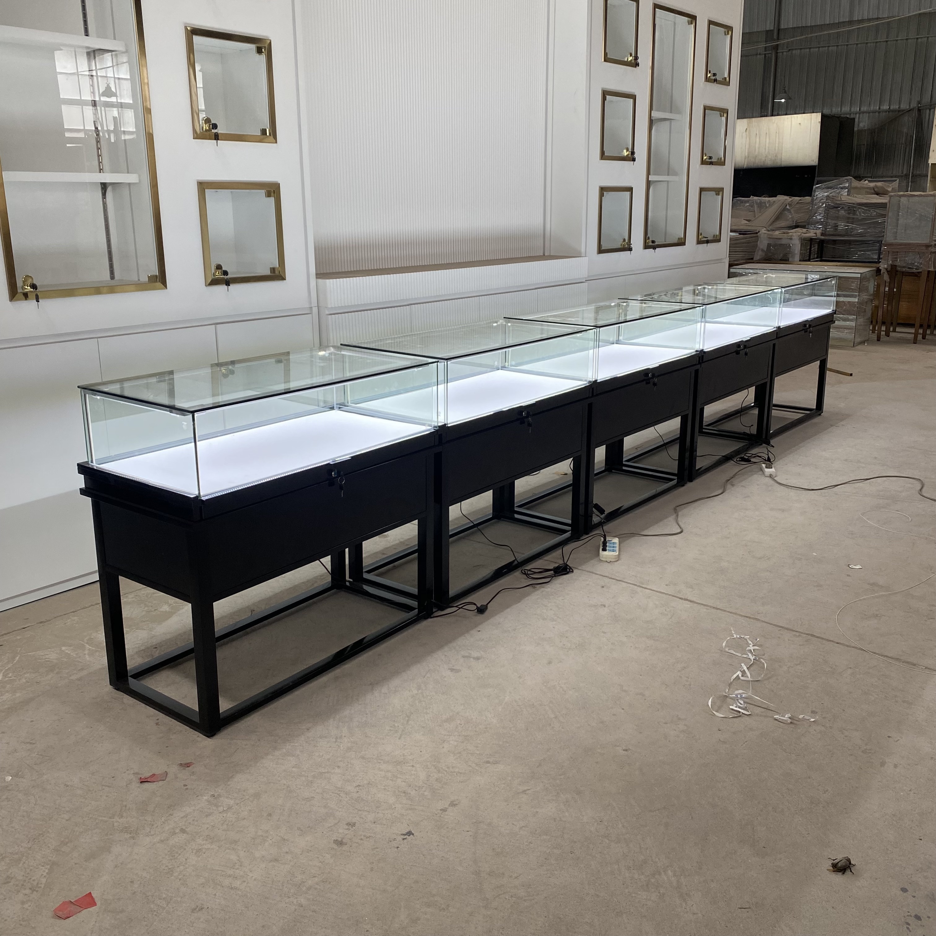La compañía tiene productos de gabinete de exhibición de joyas negras.
