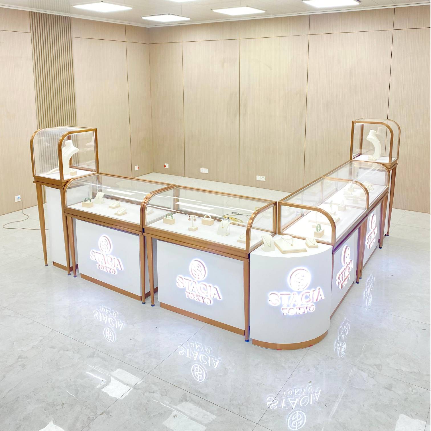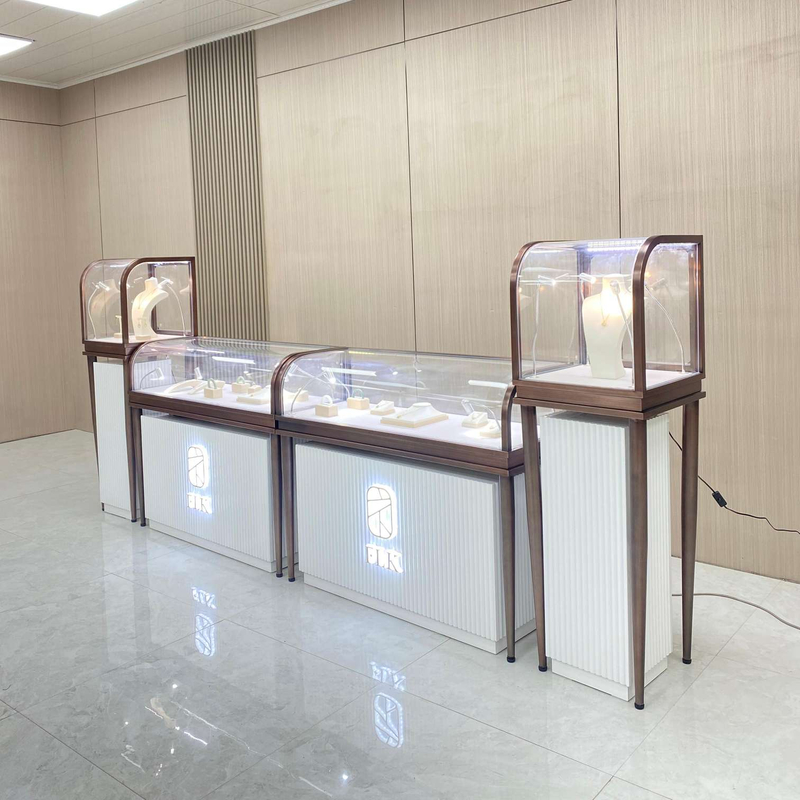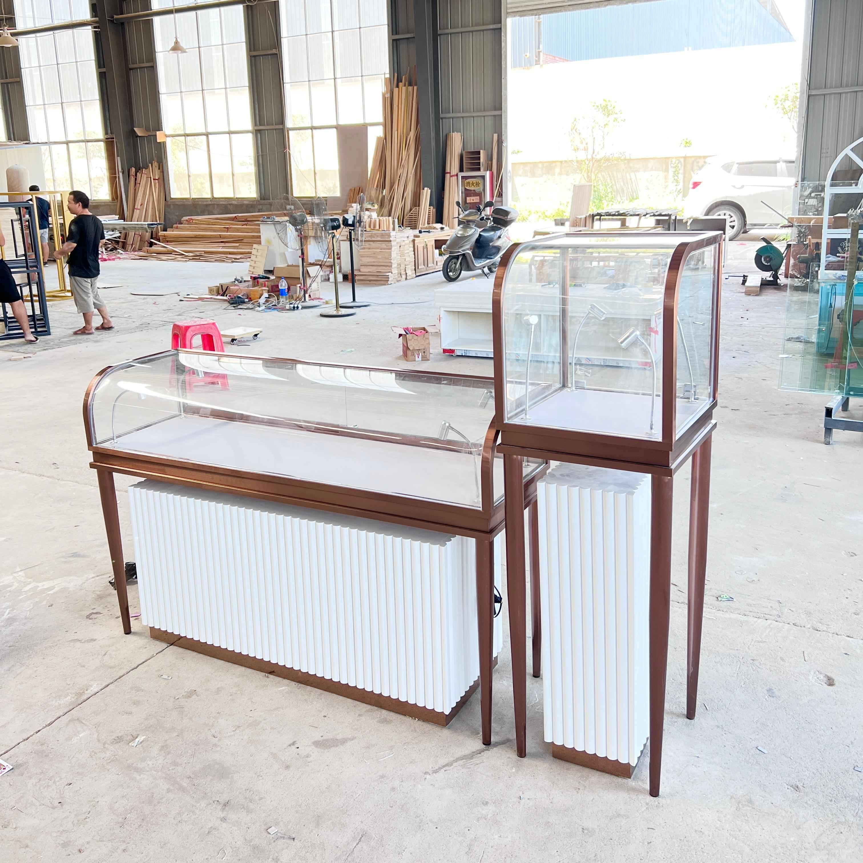 Este gabinete de exhibición de joyería personalizado, hecha a partir de acero inoxidable con un acabado cepillado de oro rosa, exuda elegancia y lujo. El tamaño delantero es L120*W55*H95cm.el tamaño vertical ISL55*W55*H140cm.El vidrio curvado no solo agrega un toque estilisio, sino que también ofrece una excelente vista de joyería. Puede agregar logotipos, permitiendo a las empresas adaptarla a su marca, un gran beneficio para las firmas de joyería mayoristas con base en el centro comercial estadounidense. El acero inoxidable asegura la durabilidad. El tono de oro rosa y el atractivo visual de vidrio curvo, atrayendo a los clientes. La personalización mejora aún más la visibilidad de la marca. En breve, es una elección perfecta para los minoristas de joyas que desean una pantalla funcional, elegante y mejorada de marca.