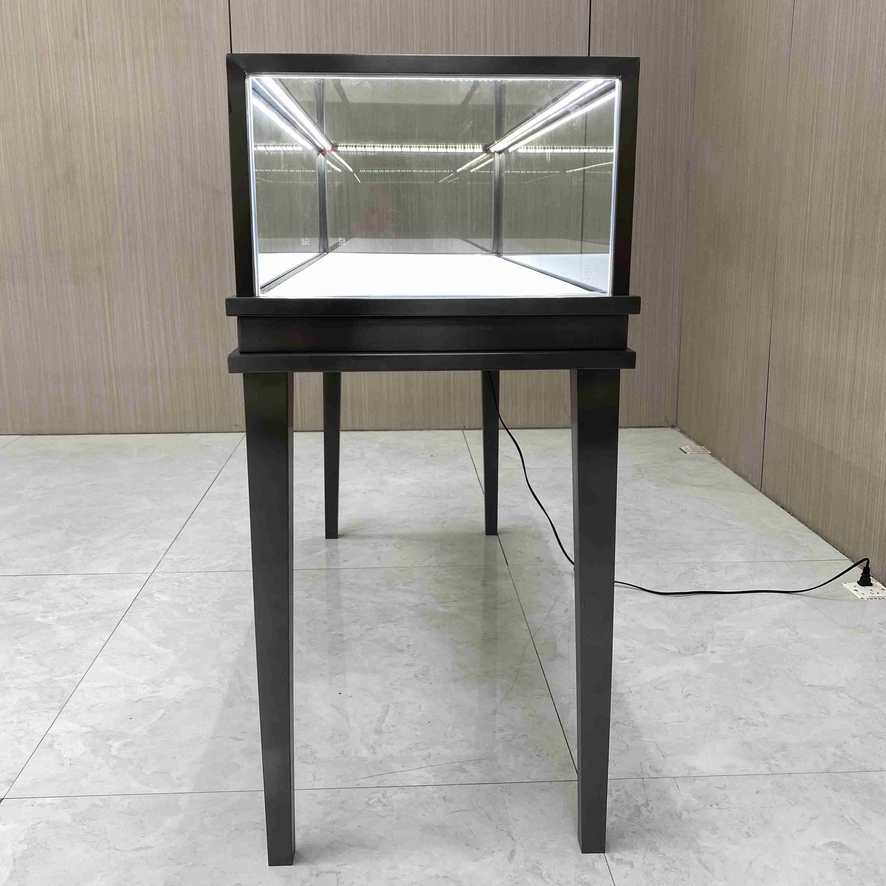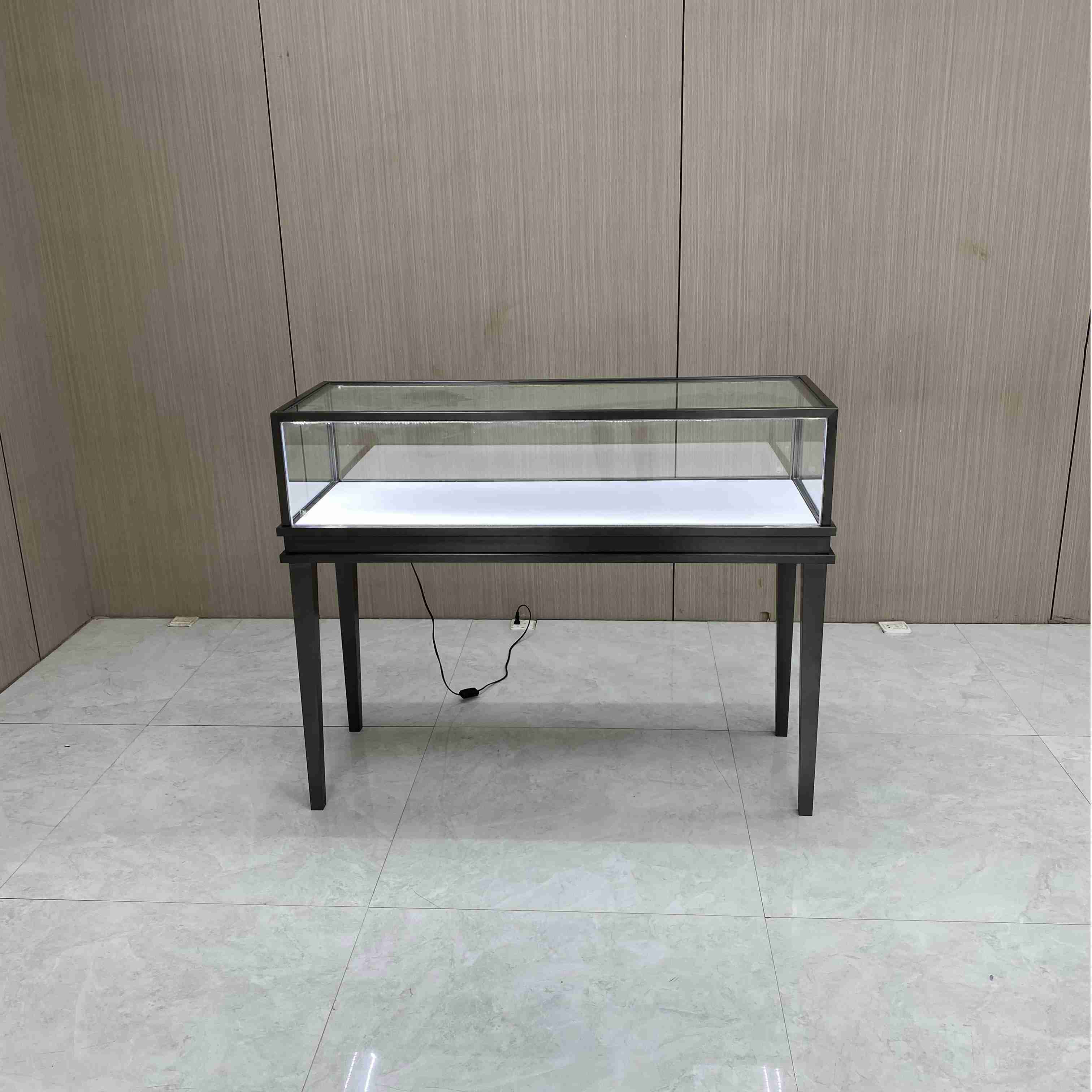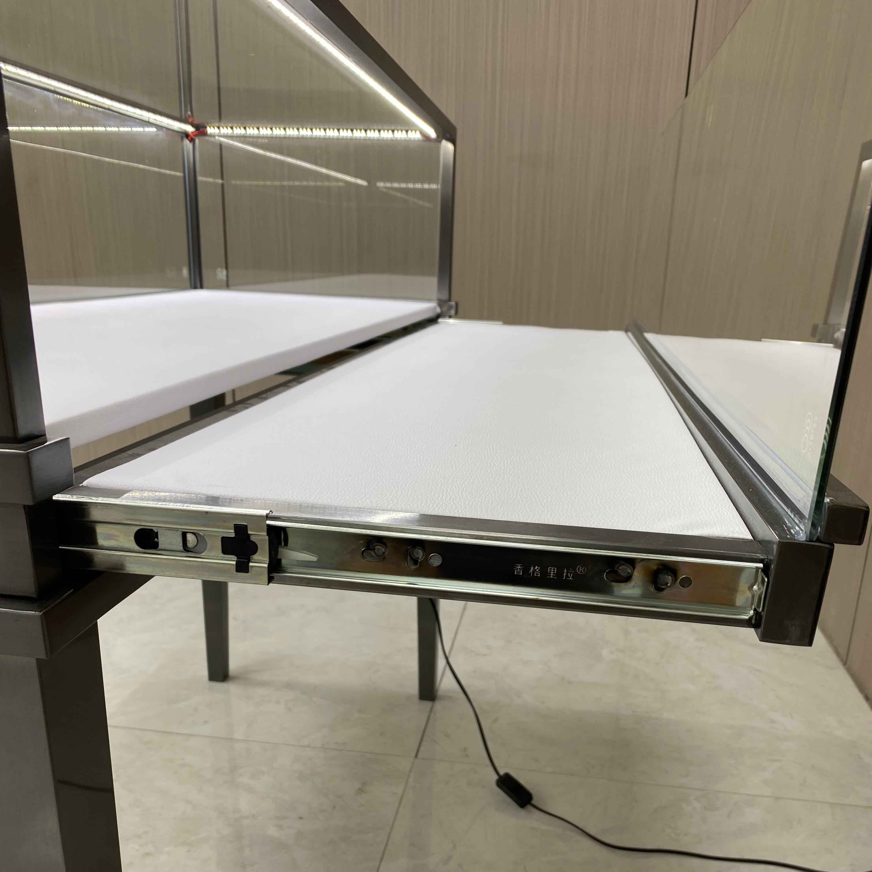 Nuestro gabinete de exhibición de joyas de acero inoxidable es una combinación perfecta de moda y practicidad. El tamaño es L120*W55*H95C. Cuenta con un acabado cepillado de acero inoxidable de titanio negro plateado, combinado con vidrio templado transparente de 8 mm, y el interior está revestido con cuero de pura blanca, exudando lujo. Está específicamente diseñado para ventas comerciales y es adecuado para el mercado francés. Si está buscando un gabinete de exhibición de joyería de alta calidad, esta es su opción ideal.