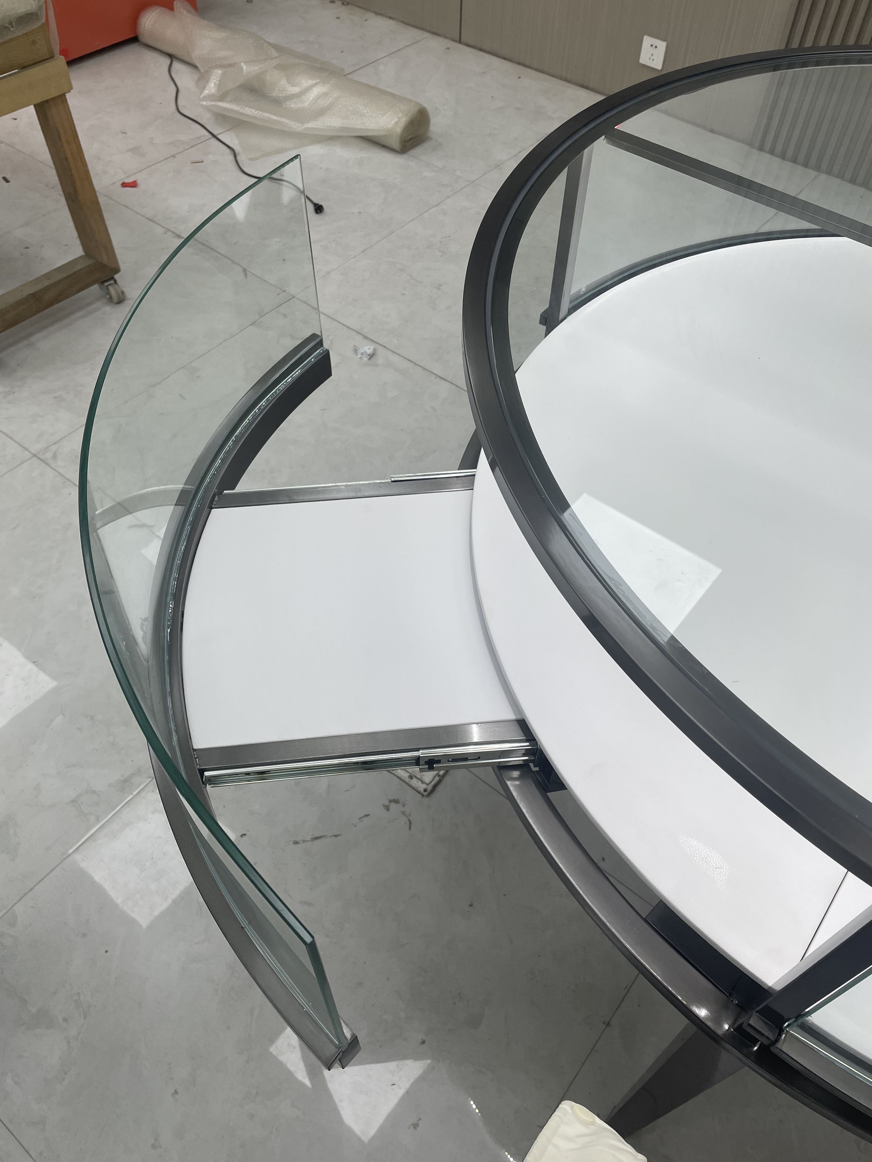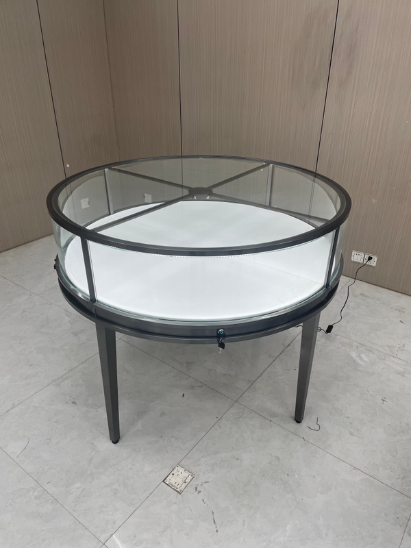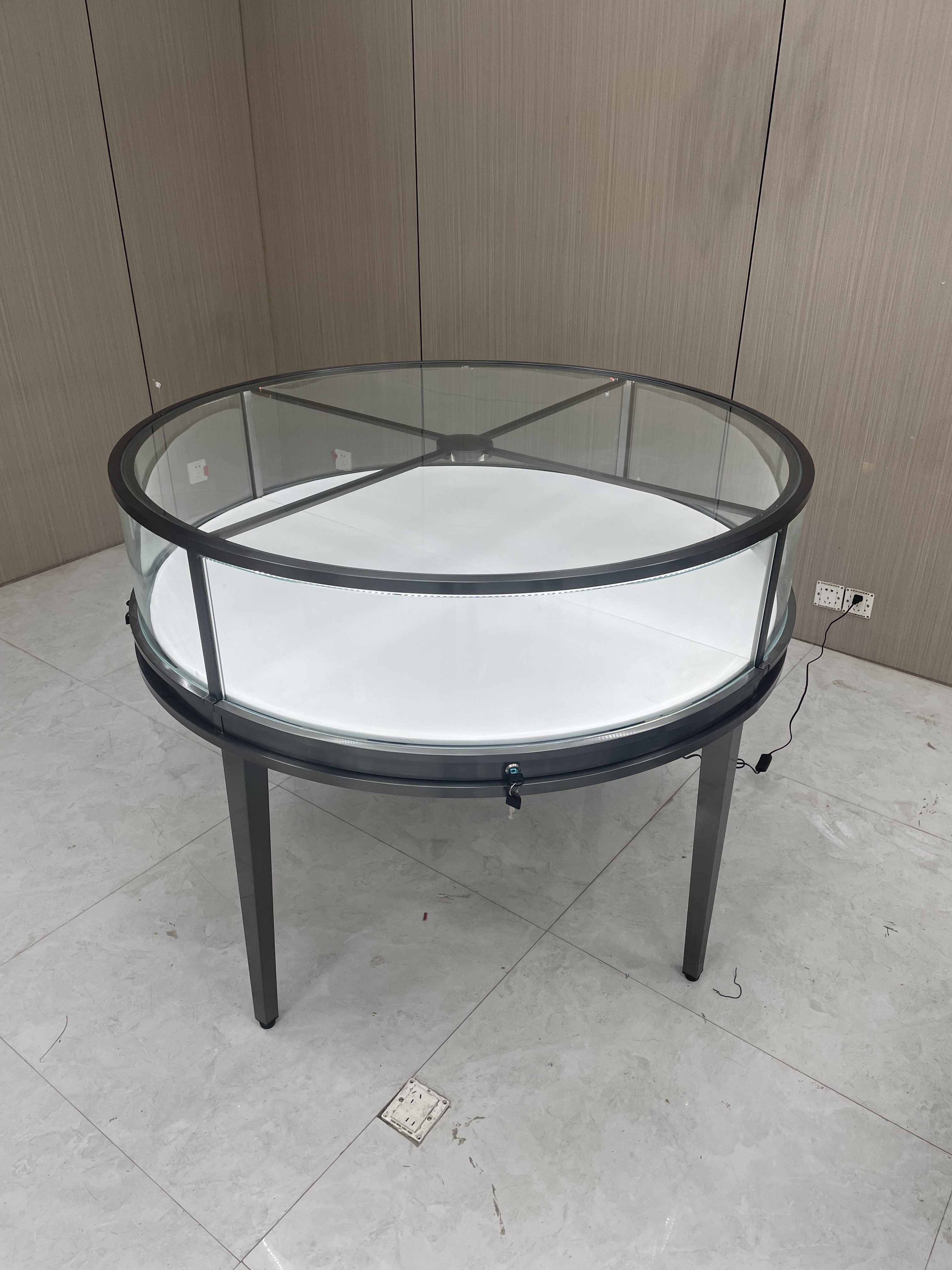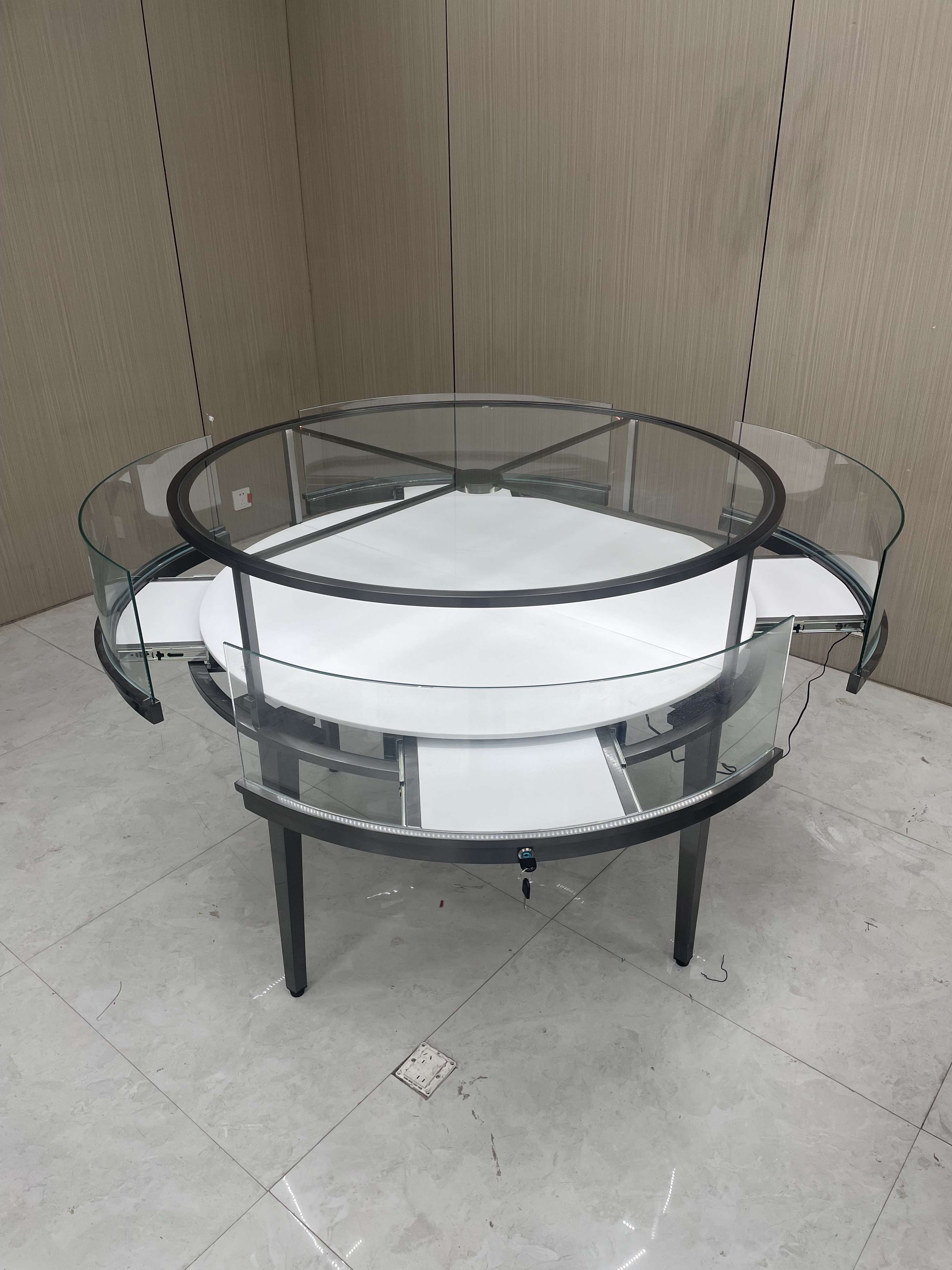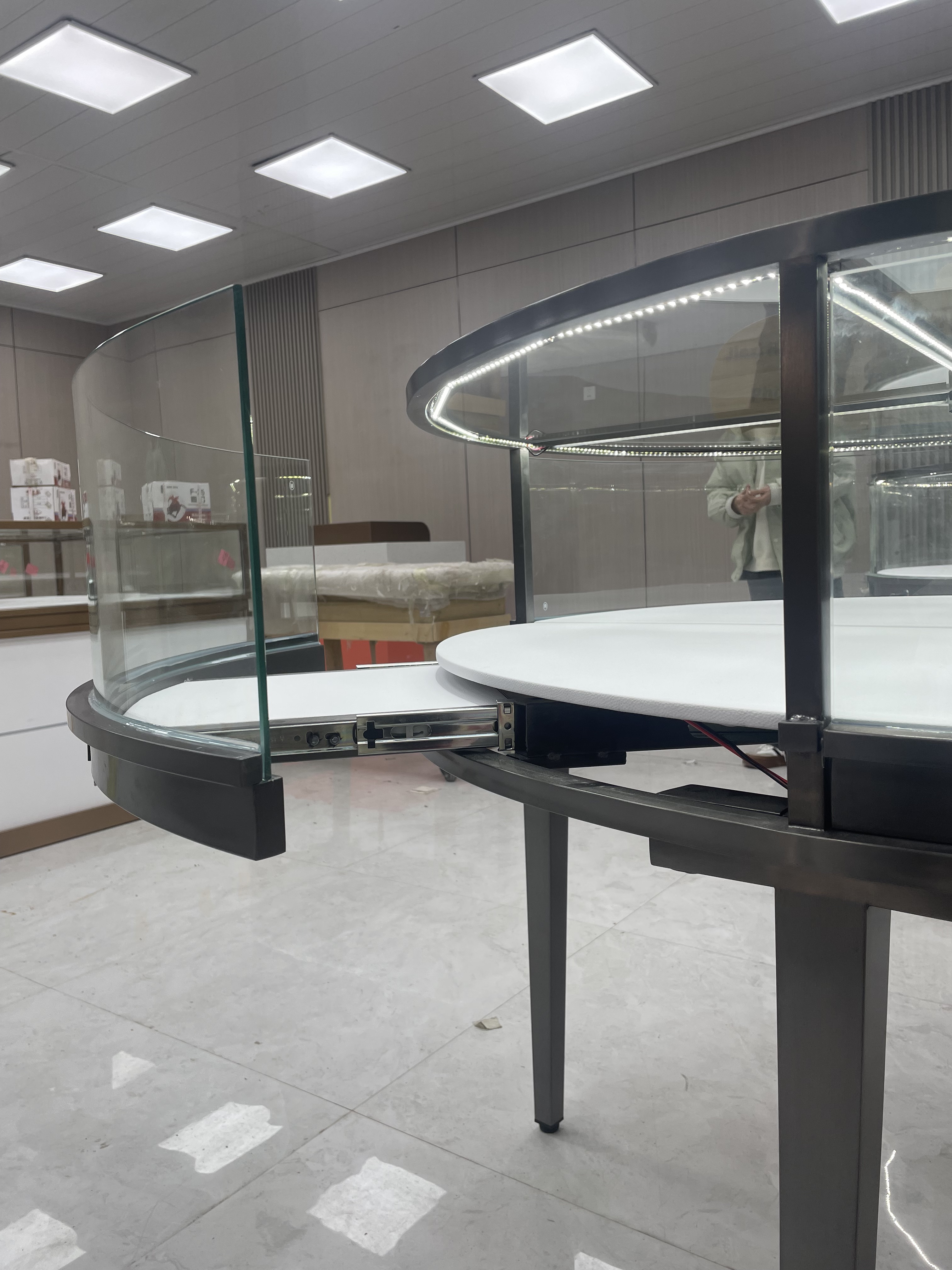 R: El gabinete de exhibición es redondo, con dimensiones de 1220 cm × 120 cm × 95 cm, ofreciendo un amplio espacio para joyas mientras mantiene una apariencia elegante y compacta.