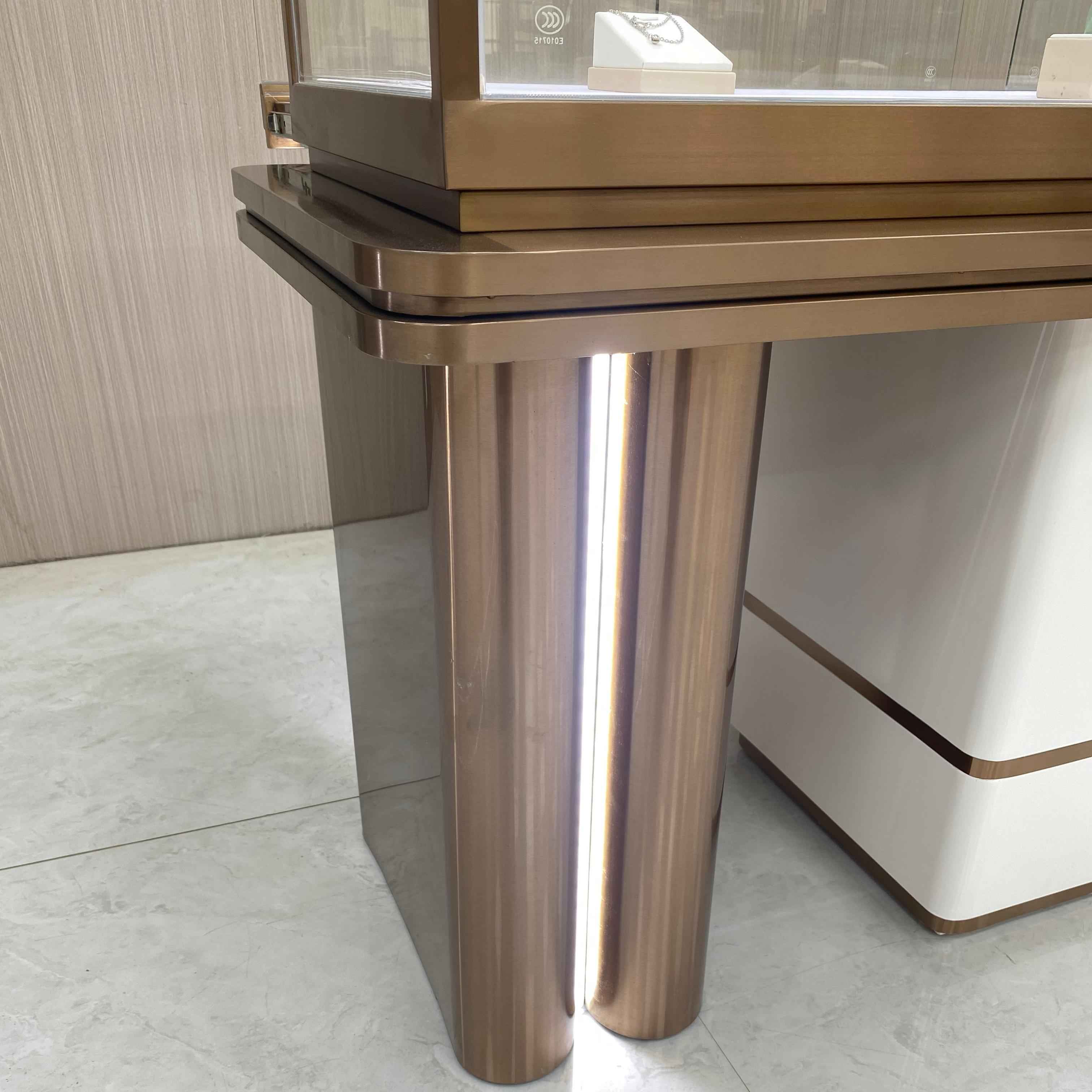Este es un gabinete de exhibición de joyería de marco de acero inoxidable. El tamaño de este gabinete es L180*W60*H95C. El gabinete está hecho de vidrio templado transparente de 8 mm, con cuero blanco de PU forra el interior. El gabinete base es blanco y se pueden agregar logotipos personalizados.